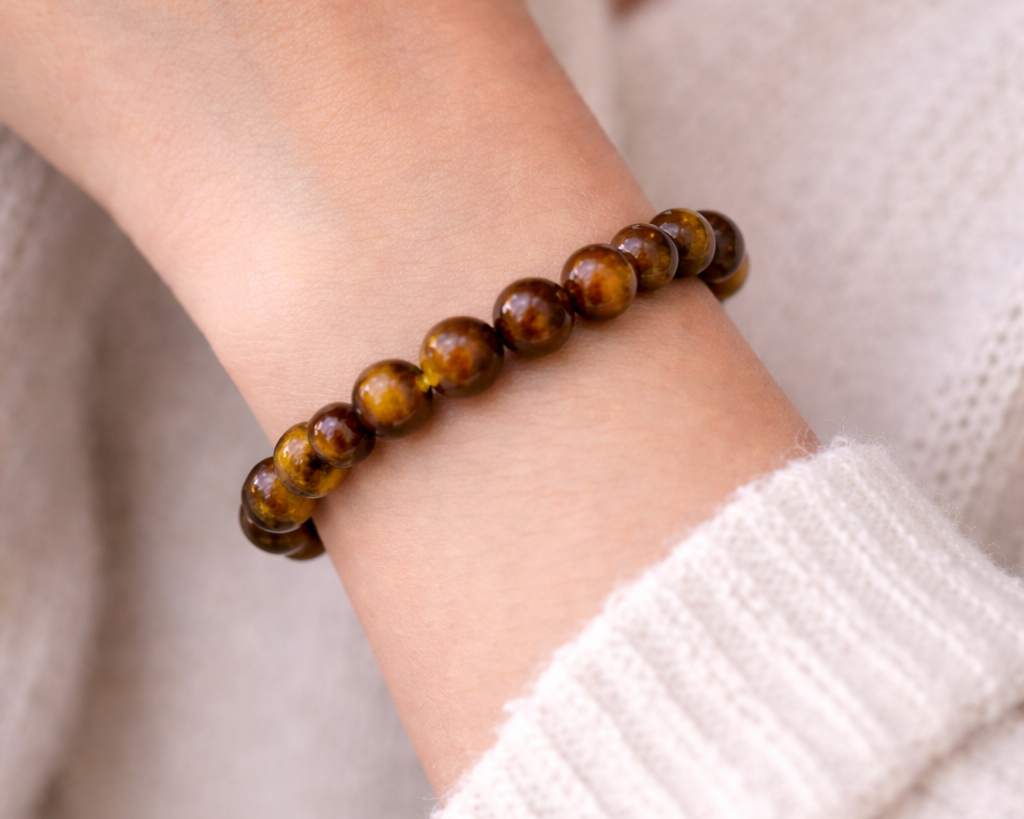 A pulseira Olho de Tigre castanha da marca Fifour é um acessório actual e fácil de combinar com diferentes estilos. Produzida com contas redondas em vidro