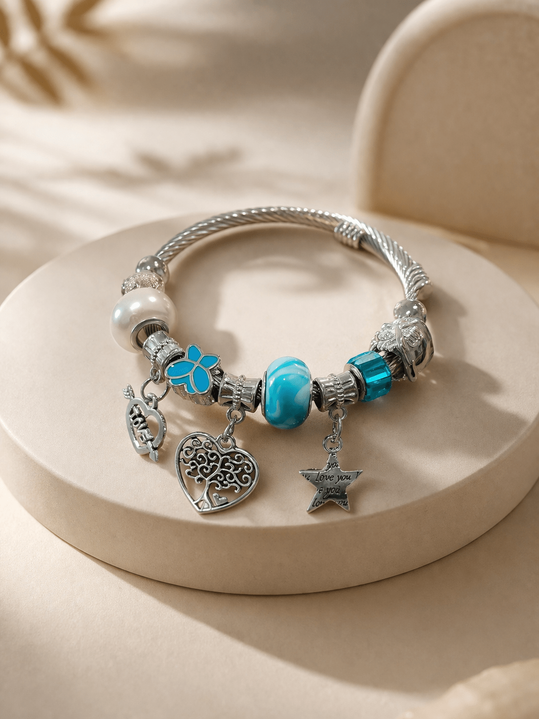 Pulseira Charm em Aço Inoxidável – Prateada com Detalhes Azul Turquesa