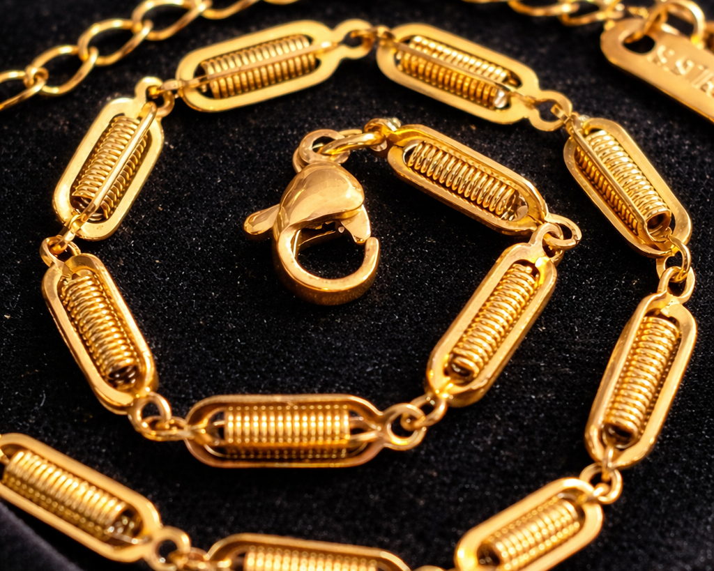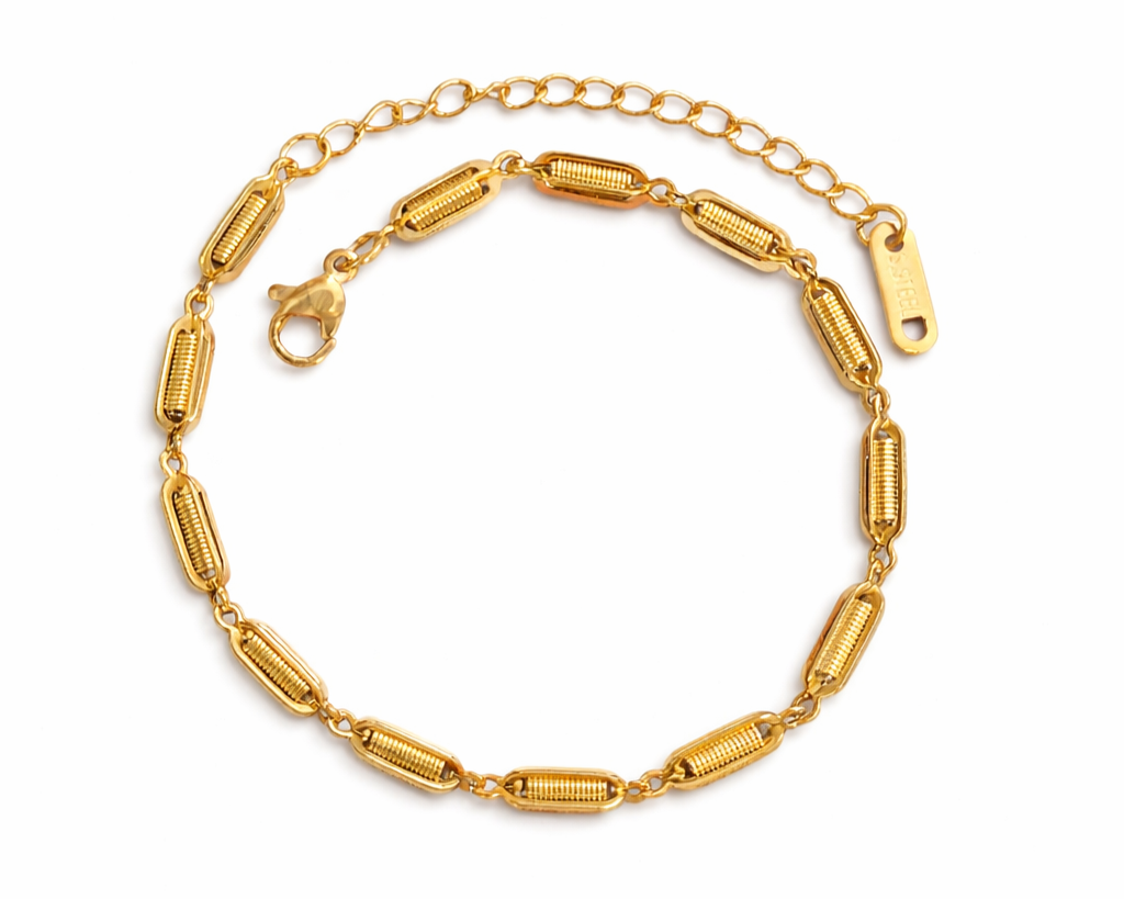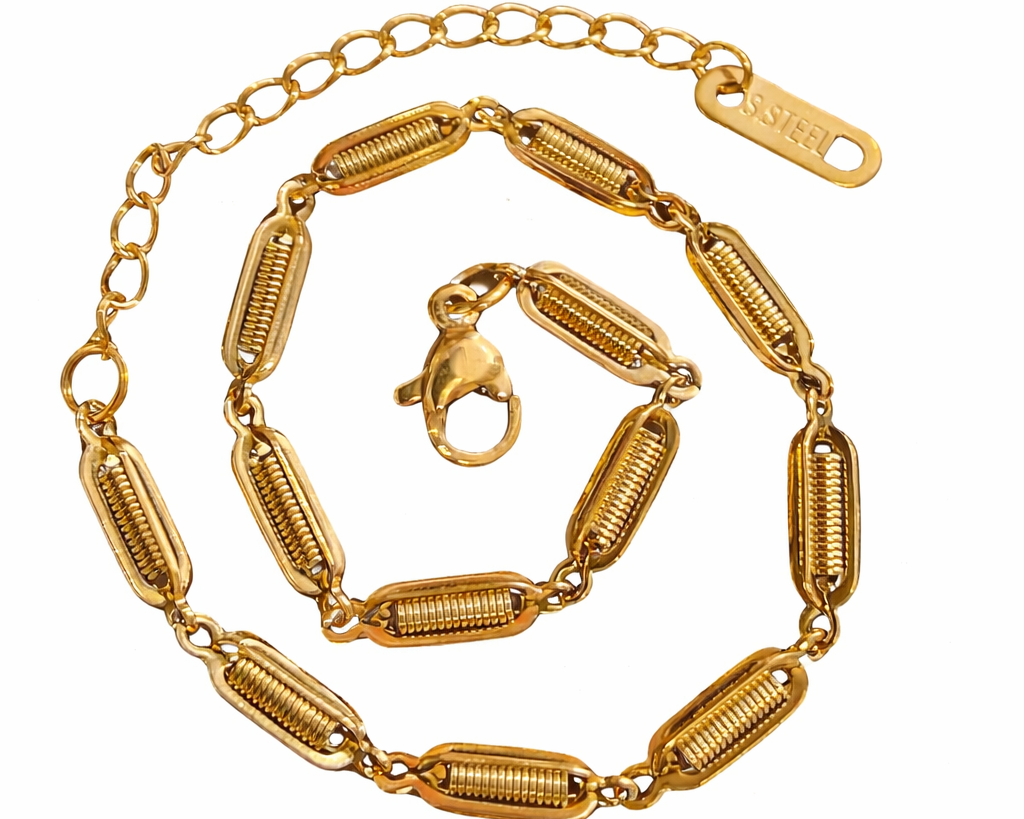 Elegante e moderna, a Pulseira Spring em aço inoxidável com banho de ouro 18K é perfeita para quem busca sofisticação e durabilidade no dia a dia